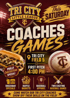 Join us out at the Fields for the Annual Coaches Game!Saturday April 25th Field 5 @ 4:00 pm & 6:00 pmRaffle baskets will be displayed and raffled off during the Coaches Game on Saturday, April 25th.